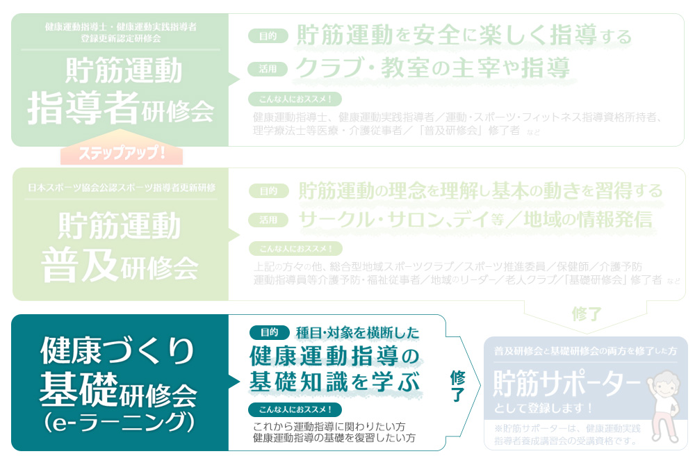 また、本研修会と、当財団が主催する貯筋運動普及研修会(実習有)の両方を修了した方を、「貯筋サポーター」と称します。