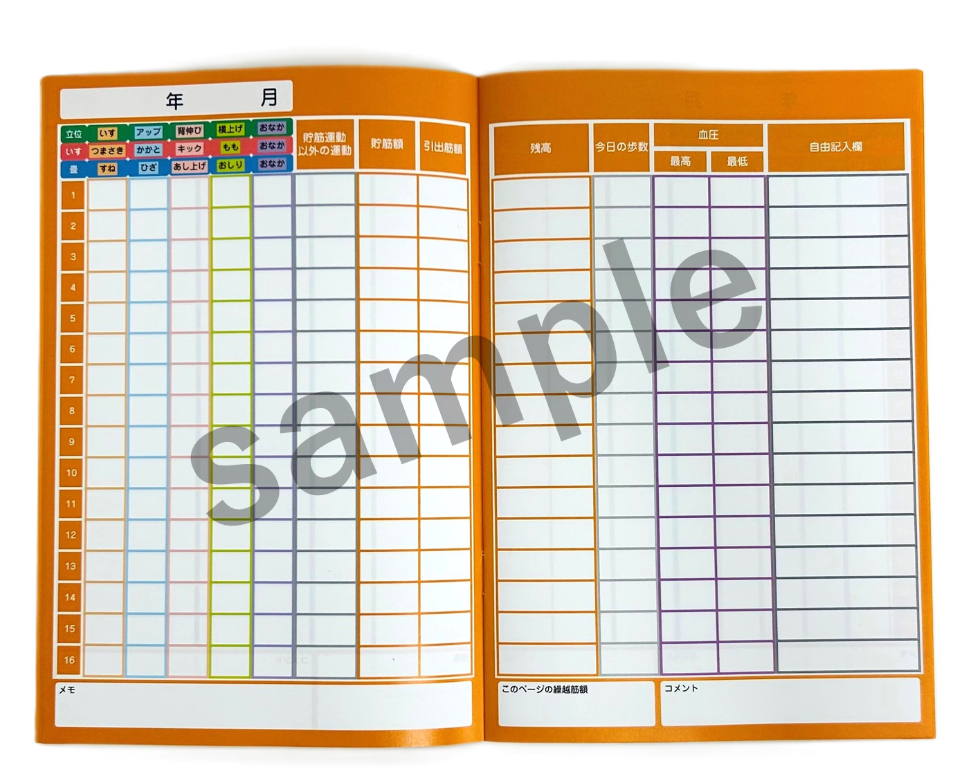 毎日、貯筋運動やそのほかに行った運動を記録できる、運動記録帳です。運動以外にも、その日の歩数や血圧、その他自由に記載できる欄もあります。