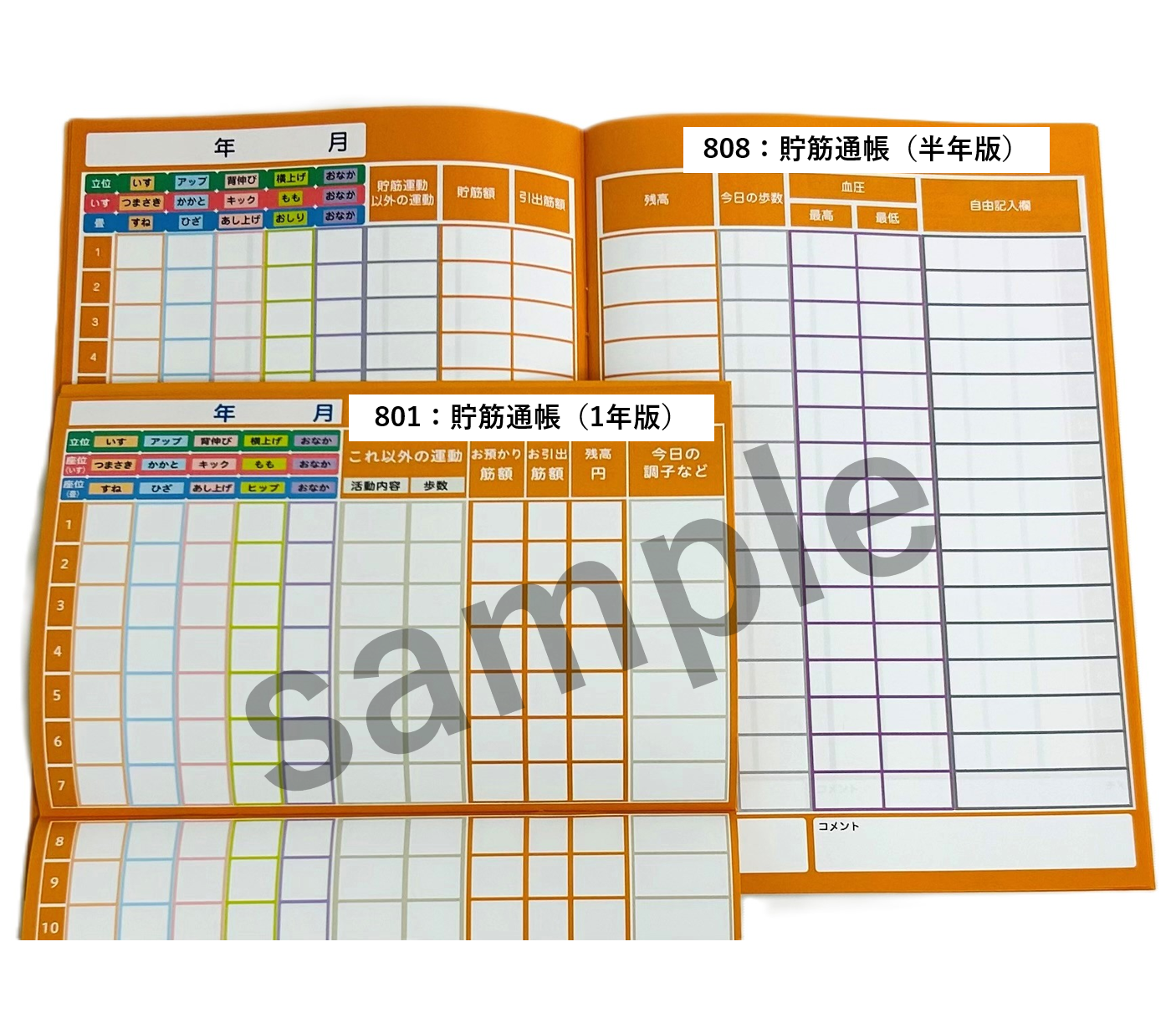 801:貯筋通帳(1年記帳版)からサイズを大きくし、筋額欄や自由記入欄のマス目が広くなりました。