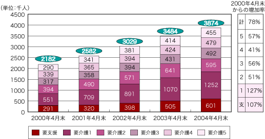 2004年4月に介護保険制度がスタートしてから、要介護者・要支援者の数は増え続けています。特に延びの大きいのは要支援者と要介護1(要介護者の中で介護の必要度が最も低い)の人で、2000年4月から2004年4月までの4年間で倍以上に増えています。