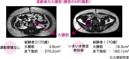 大洋村(茨城県)の運動教室に定期的に参加している70歳の女性の腰の部分をMRIで撮影したところ、運動習慣のない70歳の女性に比べて、大腰筋が明らかに太いことがわかりました。