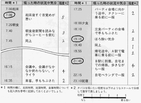 これまで、あまり意識せずに吸い続けてきた長年の喫煙習慣。これを注意深く観察すると、自分の喫煙パターンがよくわかり、禁煙するのに大変参考になります。以下の要領で、自分の喫煙行動を記録しましょう。(1)吸った時間、(2)吸った時の状況や気分、(3)吸いたいと感じた程度、の3点についてチェックし、特においしいと感じた時間を○印で囲みましょう。自分がどのような状況下でタバコを吸うのかがわかります。自分がいかに惰性で、毎日多くのタバコを吸っているか、よくわかります。また、喫煙行動を記録すると、タバコを意識して吸うようになるので、それだけタバコの本数が減るという意外な効果もあります。
