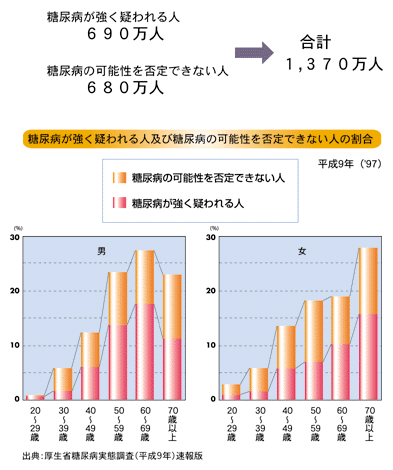 調査方法が違う1997年に行われた調査によると、さらにたくさんの患者がいるだろうと推定されています。具体的には、糖尿病が強く疑われる人が690万人、糖尿病の可能性を否定できない人が680万人、合計1,370万人と推定されます。