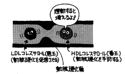 有酸素運動はHDL(善玉コレステロール)を増加させます。また動脈硬化を予防する効果があります。しかし、強い運動は不整脈や狭心発作を誘発する危険があります。運動中に不快な胸痛や息切れを感じたら中止して、必ずかかりつけの医師に相談して下さい。