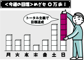 | ○ 必ずしも、まとまった歩く時間をとる必要はありません。「エレベーターやエスカレーターを使わず階段を上る」「時間があるときは、一つ手前の駅で降りて一駅分歩く」「車ではなく歩いて買い物に行く」など、生活の中の基本的な身体活動を増やすことが大切です。 ○ 1万歩を連続して歩こうとすると、1時間以上かかります。歩くための時間を1時間以上も捻出するのが無理な人は、1日の中で分散して歩く時間を取ったり、1週間の中で分散して取るようにします。たとえば、平日の歩数が不足したならば、休日に不足分を取り戻す、というようにトータルで考える「トータル主義」が運動継続のポイントです。 |