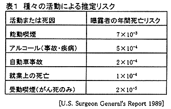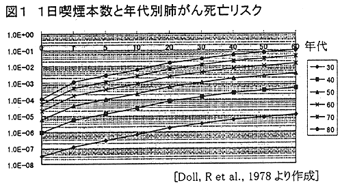 ● たばこ(能動喫煙・受動喫煙)は他の直接的な死因と比べて、最大の死亡リスクである(表1)1 。また、英国の男性医師コホート研究をもとにしたモデルによると、喫煙本数が増えるにつれて、年代別の肺がん死亡率は指数関数的に増加する2。