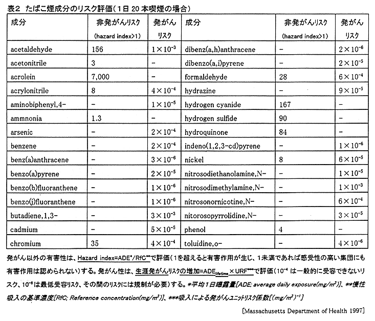 ● たばこ煙には4000種以上の化学物質が同定されている1が(推定では数万〜十万種以上が発生3)、定性・定量データのある一部の成分について、米国マサチューセッツ州衛生部が発がん以外の有害性と発がん性のリスク評価を行い、多くの成分に対し許容範囲を超えたリスクを認めている(表2)4 。