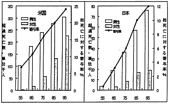 | 図5 紙巻たばこ消費量の日米比較 | 図6 たばこによる超過死亡数と総死亡への寄与率の日米比較 | |