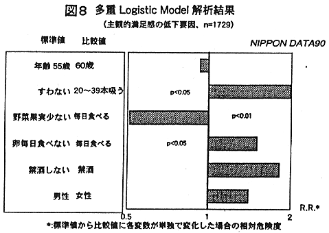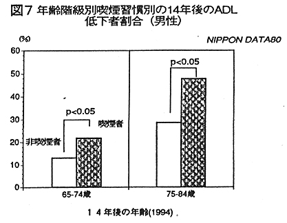 ●また、我が国の最近の疫学研究により、たばこは総死亡のリスクを高めるのみならず、死亡に至らずとも、ADL(日常生活動作)やQOL(生活の質)を低下させることが示されており(図7、図8)10 、今後医療費や介護費用の負担増加に寄与することが予測される。