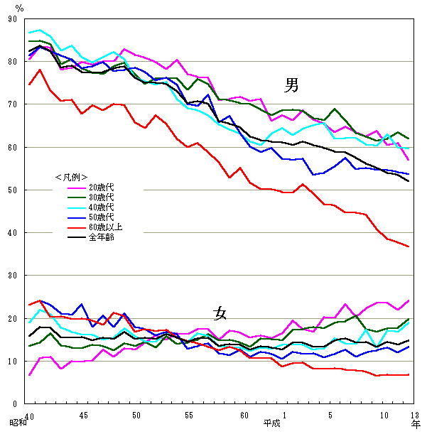 20歳代 30歳代 40歳代 50歳代 60歳以上 全年齢 年度 男 女 男 女 男 女 男 女 男 女 男 女 昭和40 80.5 6.6 84.7 13.5 86.7 19.0 81.4 23.0 74.6 23.0 82.3 15.7 41 83.5 10.6 84.8 14.3 87.3 22.0 83.4 24.1 78.0 24.1 83.7 18.0 42 83.2 11.0 84.1 16.4 85.8 20.9 82.3 23.1 73.3 20.3 82.3 17.7 43 78.0 8.1 79.3 13.6 82.5 17.8 81.3 21.1 70.8 20.4 78.5 15.4 44 78.5 9.9 80.6 13.1 83.7 16.8 80.3 20.7 71.1 19.8 79.1 15.4 45 79.9 9.8 78.4 13.0 81.0 16.1 78.3 23.3 67.8 20.0 77.5 15.6 46 79.2 10.2 77.3 13.7 79.7 16.1 78.8 17.9 69.8 19.4 77.4 14.7 47 80.0 12.7 77.0 13.4 81.0 14.9 79.8 20.6 68.5 18.5 77.6 15.5 48 80.1 11.0 78.8 12.4 82.2 15.5 77.7 18.0 70.1 21.2 78.3 15.1 49 82.9 12.9 79.7 14.1 80.6 17.6 78.0 21.1 69.7 20.5 78.8 16.7 50 81.5 12.7 7.07 13.5 76.3 15.7 78.6 17.9 65.8 16.8 76.2 15.1 51 80.8 14.3 74.8 14.4 75.4 14.6 77.5 17.4 64.4 17.5 75.1 15.4 52 79.9 16.0 76.0 13.2 74.5 14.5 75.5 16.0 67.4 17.0 75.1 15.1 53 78.2 14.9 76.0 15.7 75.3 16.6 76.3 16.8 65.5 17.3 74.7 16.2 54 80.3 16.4 76.1 14.0 71.2 15.5 74.6 16.3 62.0 15.4 73.1 15.4 55 77.1 16.2 73.4 14.2 69.1 14.4 70.0 12.8 6.00 14.6 70.2 14.4 56 76.4 17.4 75.9 14.9 68.6 16.5 69.6 13.5 60.9 14.1 70.8 15.3 57 76.2 17.4 74.7 16.2 67.5 15.7 72.2 14.1 58.8 13.3 70.1 15.4 58 70.9 15.0 71.3 14.8 65.2 13.4 65.7 11.8 56.5 12.4 66.1 13.5 59 71.3 17.1 70.9 15.0 64.1 13.3 67.2 11.3 52.8 13.3 65.5 14.0 60 71.8 16.6 70.2 14.2 63.1 13.2 63.3 12.6 55.2 12.4 64.6 13.7 61 70.8 15.5 70.0 13.3 61.2 12.3 60.1 11.0 51.7 10.7 62.5 12.6 62 71.2 15.9 68.7 15.3 60.5 13.2 58.8 12.1 50.2 10.6 61.6 13.4 63 66.1 15.2 67.4 15.1 63.1 12.8 59.7 11.6 50.2 10.6 61.2 13.1 平成01 67.5 16.4 68.5 14.7 64.5 13.8 57.3 10.4 49.5 8.6 61.1 12.7 02 66.3 19.5 68.7 17.2 62.7 14.0 57.0 12.2 49.4 9.4 60.5 14.3 03 68.5 17.5 68.4 17.5 64.3 13.7 57.3 11.6 51.3 9.7 61.2 14.2 04 66.4 16.7 66.7 17.9 65.1 12.6 53.4 11.8 49.2 8.2 60.4 13.3 05 65.4 20.3 66.2 17.6 65.6 13.0 53.9 10.8 46.7 8.2 59.8 13.3 06 63.4 20.1 68.9 18.9 62.0 15.3 55.5 11.6 46.4 8.3 59.0 14.8 07 64.7 23.3 66.3 19.3 62.1 14.1 57.5 12.6 44.7 7.9 58.8 15.2 08 63.4 20.3 63.3 20.6 62.1 14.0 54.8 11.0 44.7 7.8 57.5 14.2 09 62.5 22.3 62.4 17.5 60.6 17.2 55.1 12.0 44.1 7.5 56.1 14.5 10 63.7 23.5 61.4 16.7 60.2 13.2 54.7 12.5 40.9 6.5 55.2 13.3 11 60.4 23.6 62.0 17.6 63.0 17.1 54.7 13.2 38.6 6.8 54.0 14.5 12 60.9 21.9 63.4 17.7 60.0 16.8 54.1 12.0 37.7 6.7 53.5 13.7 13 56.9 24.1 62.0 19.7 59.6 18.9 53.6 13.3 36.7 6.8 52.0 14.7