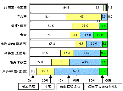 医療機関の禁煙や分煙の実施状況は、「診察室・検査室」では「完全禁煙」を行っている割合が約9割となっているが、「待合室」や「病棟・病室」、「食堂」では、「完全禁煙」の割合が約5割に止まっている。