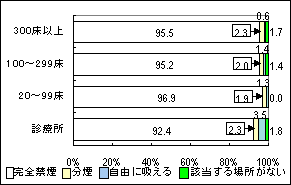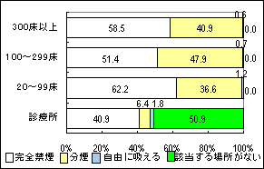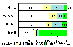 病床規模別にみると、「待合室」を完全禁煙とした割合は診療所で高くなっている。