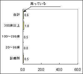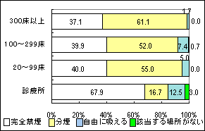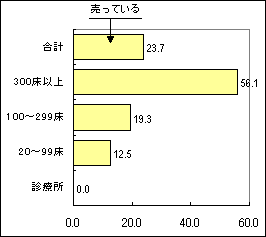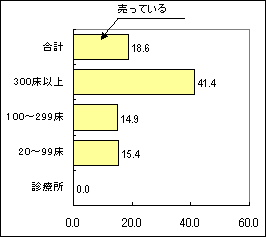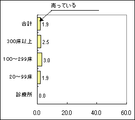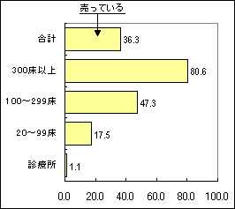 たばこ販売の状況については、診療所ではほとんど売っておらず、病院では規模が大きくなるほど売っている割合が高い。300床未満では半数以下であるのに対し、「300床以上」の施設では約8割で売っている。