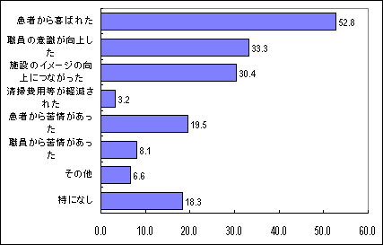 禁煙・分煙推進のメリット・デメリット(有効回答589)については、メリットでは、「患者から喜ばれた」が約5割で最も高く、次いで「職員の意識が向上した」と「施設のイメージの向上につながった」が約3割となっている。デメリットでは、「患者から苦情があった」が約2割となっている。