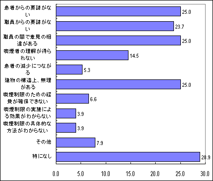 禁煙・分煙を実施していない医療機関にその理由を聞いたところ(有効回答76)、「特になし」が28.9%で最も多く、次いで「患者からの要請がない」、「建物の構造上無理がある」、「職員の間で意見の相違がある」が25%、「職員からの要請がない」が23.7%となっている。
