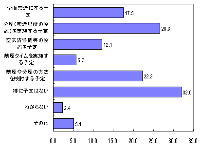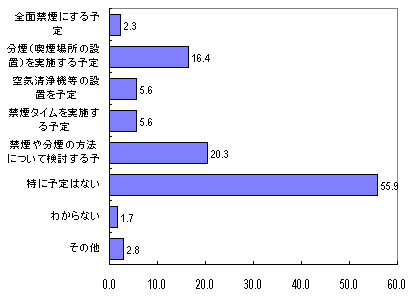 禁煙・分煙を実施していない事業者に今後の方針を聞いたところ(有効回答177)、「特に予定はない」が55.9%で最も多く、次いで「禁煙や分煙の方法を検討する予定」が20.3%となっている。