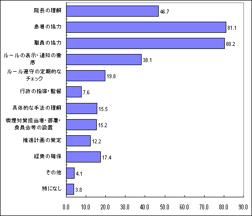 禁煙・分煙対策を進める上で必要と考えるものは何かを聞いたところ、「患者の協力」、「職員の協力」が約8割で最も多く、次いで「院長の理解」、「ルールの表示・通知の徹底」等となっている。