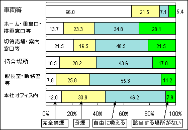 また、実際の禁煙・分煙状況(図1-1)との比較では、公共の場所では原則禁煙と思う事業者が5〜7割弱あるのに、実際には「車両等」以外の「ホーム・乗車口等」、「切符売場・案内窓口等」及び「待合場所」で「禁煙」の実施率は約1〜2割にとどまっている。