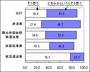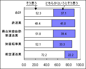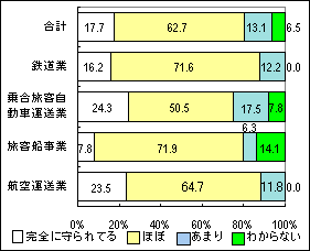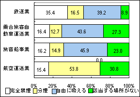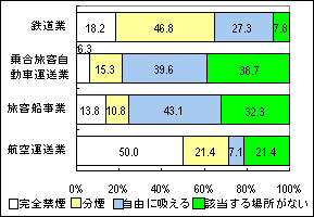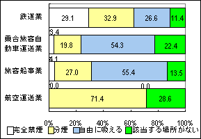 業種別に見ると、「車両等」において「完全禁煙」となっている割合は鉄道業、乗合旅客自動車運送業全業及び航空運送業で8割前後となっている一方で、旅客船事業では約25%にとどまっている。「待合場所」では、「完全禁煙」の割合が鉄道業で約3割であるが、他の業種は5%に満たない。また、「自由に吸える」割合は乗合旅客自動車運送業と旅客船事業で5割を越える一方、航空運送業はその割合が0%となっている。