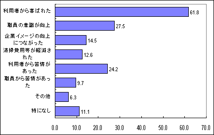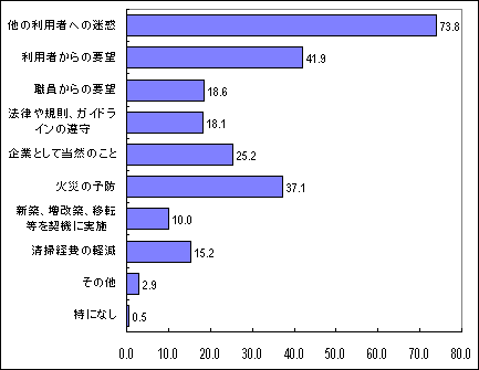 禁煙・分煙を実施した理由については(有効回答210)、「他の利用者への迷惑」が約7割で最も多く、次いで「利用者からの要望」、「火災の予防」が約4割、「企業として当然のこと」が約25%となっている。