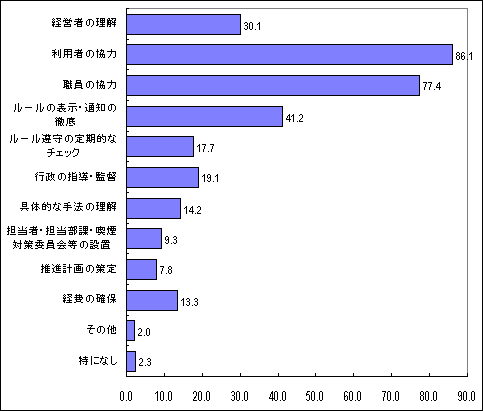 禁煙・分煙対策を進める上で必要と考えるものは何かを聞いたところ、「利用者の協力」、「職員の協力」が約8割で最も多く、次いで「ルールの表示・通知の徹底」が約4割、「経営者の理解」が約3割となっている。