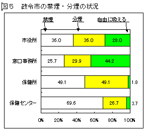 職場の事務室等を「禁煙」としている割合を見ると、保健所や保健センターで高く、全般的にその割合が高くなっているが、一方で市町村窓口事務所や県庁舎においては「自由に吸える」割合が50パーセントを超えている。