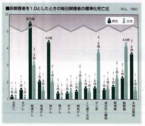 非喫煙者と比べると毎日たばこを吸う人では、男性で約4.5倍、女性で約2.3倍、肺がんによる死亡の危険が高くなり(図)、特に男性では肺がんによる死亡の約70%は喫煙が原因であると言われています。さらに男性の喉頭がんになると95%以上が、喫煙が原因と考えられています。また、がんのみでなく、食生活の欧米化に伴い、今後増加が危倶されている心筋梗塞など虚血性心疾患においても、喫煙は主要な危険因子の一つです。そして、この調査において死亡した男性約3万2000人のうち、18%がたばこが原因であると推測されています。