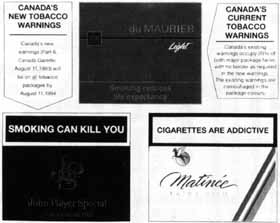警告文言8種全ての紙巻きたばこ包装に以下の警告文の1つを掲載せねばならない。(包装の最大面の表面と裏面各々に英語とフランス語で。)