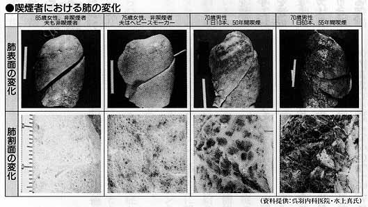 たばこの「煙」は粒子相と気相からなっていて、粒子相全体をタールといいます。これは肺の中で固まって粘着性のヤニ状のものになってがんを発生させるものであり、その中にはたばこを吸わずにはいられない癖がつくニコチンや砒素、ビレン、カドミウム等の有害物質が含まれています。また気相にも血液中の血色素(ヘモグロビン)と結びついて血液中の酸素の量を少なくし、心臓の動きなどを不十分にする一酸化炭素や窒素化合物、アンモニア、アセトアルデヒド等の有害物質が含まれています。