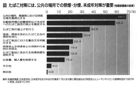 なお、今回、日本医学会の会員である医師を対象に行った調査によると、喫煙が健康に与える影響について、国民への情報提供を推進すべきであるという意見が過半数を占め、また、具体的な対策として、公共の場所等での禁煙や分煙を義務化すべきとの意見や未成年者へのたばこ販売の禁止を徹底すべきとの意見が多く示されている。