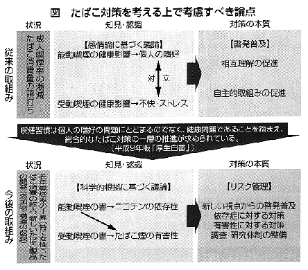 わが国におけるたばこ対策は、21世紀に向けた総合的なたばこ対策の礎として平成7年に公衆衛生審議会により意見具申された「たばこ行動計画検討会報告書」に基づき、「防煙対策」、「分煙対策」、「禁煙支援・節煙対策」を3つの柱として、各実施主体の自主的なたばこ対策の取組みを促進するため、啓発普及を中心として取り組まれてきました。