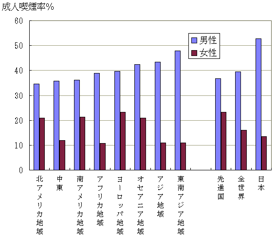 成人喫煙率は、先進国では男女の差が小さく、途上国では男性で高く女性で低いため男女差が大きいという違いがあります。日本など西太平洋地域は特に男女の差が大きいのが特徴ですが、最近若い女性の喫煙率の上昇が問題になっています。