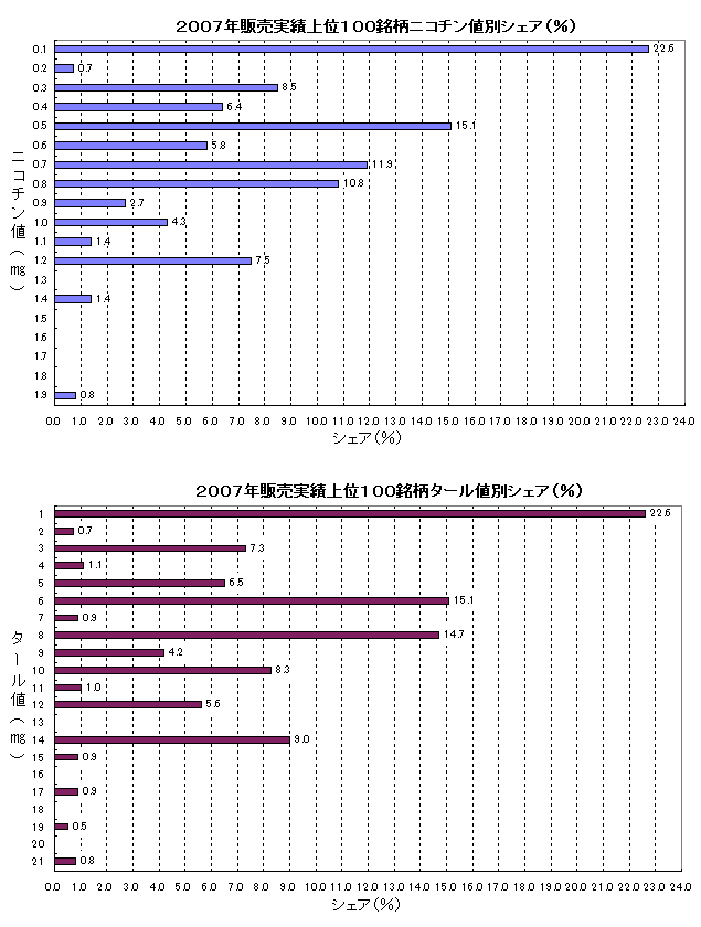 各銘柄の包装に表示されたニコチン・タール量を対比するこで、全体における位置づけが分かります。