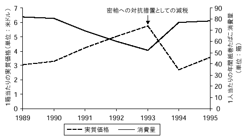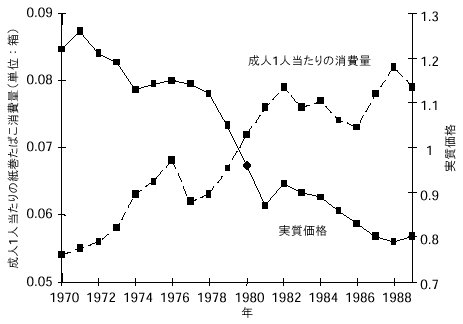 商品価格が上昇すると、その商品の需要は減少するというのが経済の原則である。過去の研究では、たばこは依存性があるためこの原則に当てはまらないとされてきた。この説によると、喫煙者はたばこ依存症になっているため、その必要性を満たすためならいくら支払うことになろうと金額にかかわらず同じ本数だけ吸い続けるというのである。しかし今では多くの研究によって、この説は間違いであり、喫煙者のたばこに対する需要は変動が少ないものの、やはりその価格に大きく影響されることが明らかになっている。たとえば、カナダでは、1982年から1992年にかけてたばこ税を引き上げたため、紙巻たばこの実質価格が著しく値上がりし、消費が大幅に落ち込んだ(図4.2a)。同様に、南アフリカ(図4.2b)、英国、その他多くの国々でも、増税のせいで紙巻たばこの消費が減少している。値上げのために喫煙をやめる気になったり、初めから喫煙しないですんだり、あるいは禁煙している者が喫煙を再開する例が減るなどの報告はたえず行われている。