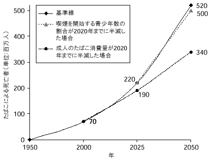 注:Peto たちのチームでは、先進諸国における1950年から2000年の間にたばこによる死亡者数が6000万人に上ると見積もっている。1990年から2000年の間に発展途上国においてさらに1000万人多くなると思われる。1990年以前の発展途上国ではたばこによる死亡者が存在せず、世界中で1950年以前にはたばこによる死亡者がごくわずかだったと仮定した。2000年以降の死亡推定値はPetoの試算(私信[1998])に基づいている。