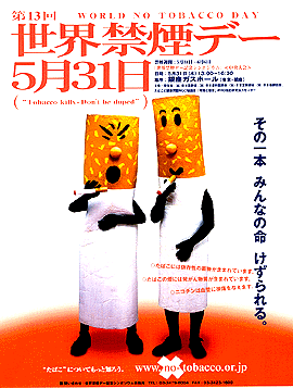 WHOの標語:Tobacco kills-Don't be duped日 時: 平成12年5月31日(水)13:00〜16:30 場 所: 銀座ガスホール(東京都中央区) 326席 主 催: 厚生省、(社)日本医師会、(社)日本歯科医師会、(社)日本薬剤師会、(社)日本看護協会、