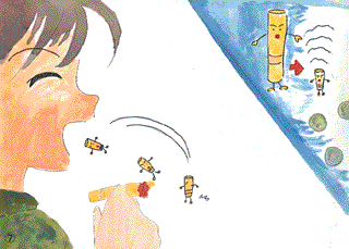 そこで僕は、まずたばこを吸っている人を見つけて、そして、ビー玉ぐらいの大きさになって飛びこもう、と思いました。
